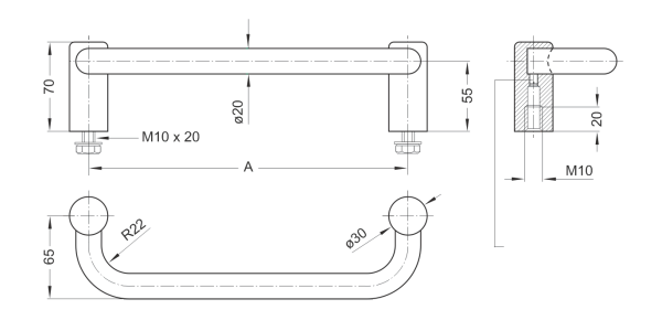 Uchwyt nierdzewny skierowany w bok A=250